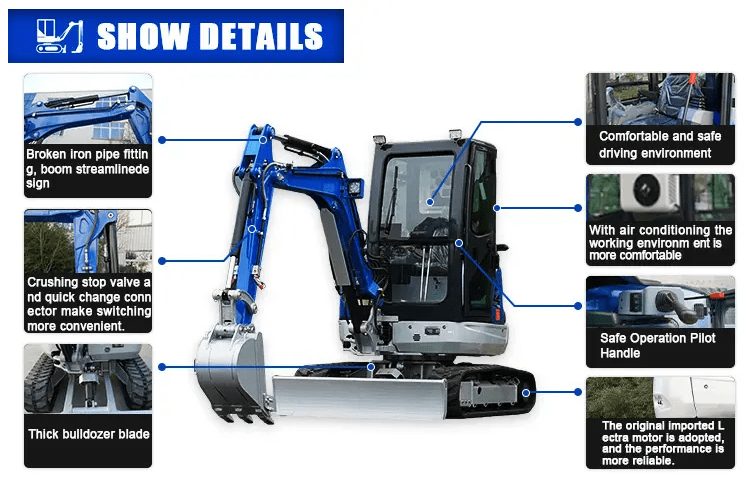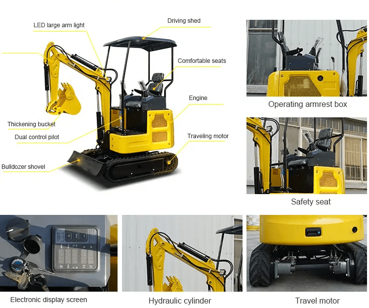The R325 is the new mini excavator from Rippa. It has a small footprint and is equipped with a modernized water-cooled twin-cylinder V-twin engine, making it more stable and flexible in operation. It is ideal for all types of pipe digging, foundation construction, utilities, landscaping and urban home repair. It has unique advantages such as low price, fast payback, light weight and easy maintenance. Water-cooled and hydraulic oil cooling. The first excavator controlled by microcomputer, whose construction parts are made of stainless steel or plastic for longer service life. Humanized design, frame, electronic throttle, etc. make it easy to operate. Electronic digital display and automatic alarm controlled by microcomputer allow customers to detect faults immediately and repair them in time. Controlled by ECU computer, it has better heat dissipation and higher efficiency.