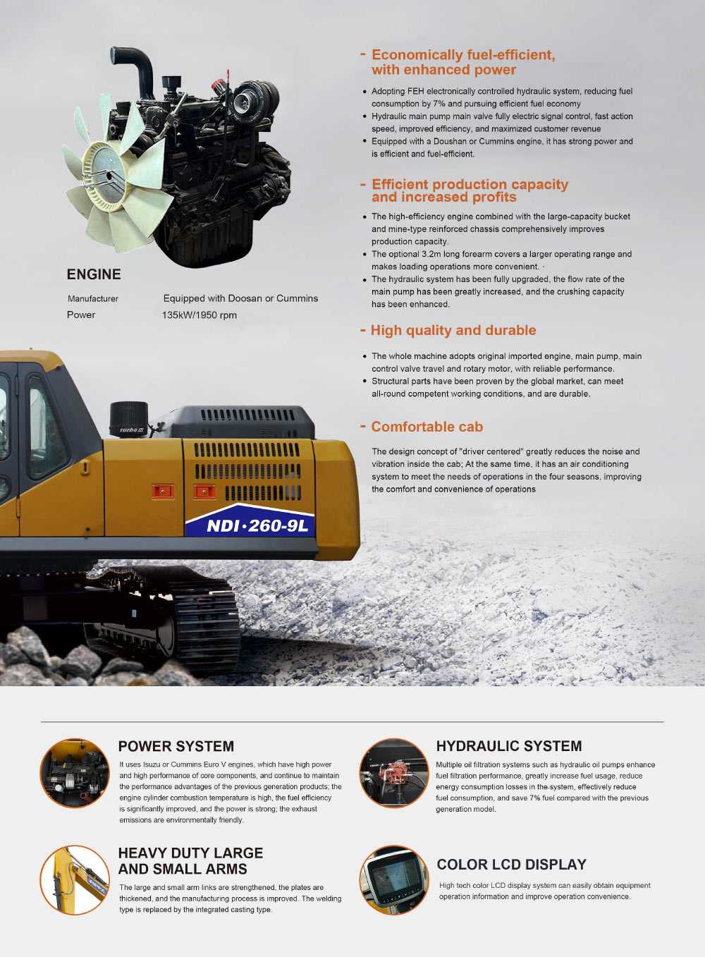 NDI260 — это большой 24-тонный экскаватор производства компании rippa, крупнейшего производителя малых экскаваторов в Китае. Он использует двигатель Cummins и аксессуары Doosan. Он обладает достаточной производительностью и мощной мощностью, а цена вдвое ниже стоимости аналогичных экскаваторов. Это лучший из 24-тонных экскаваторов. Самый экономичный большой экскаватор