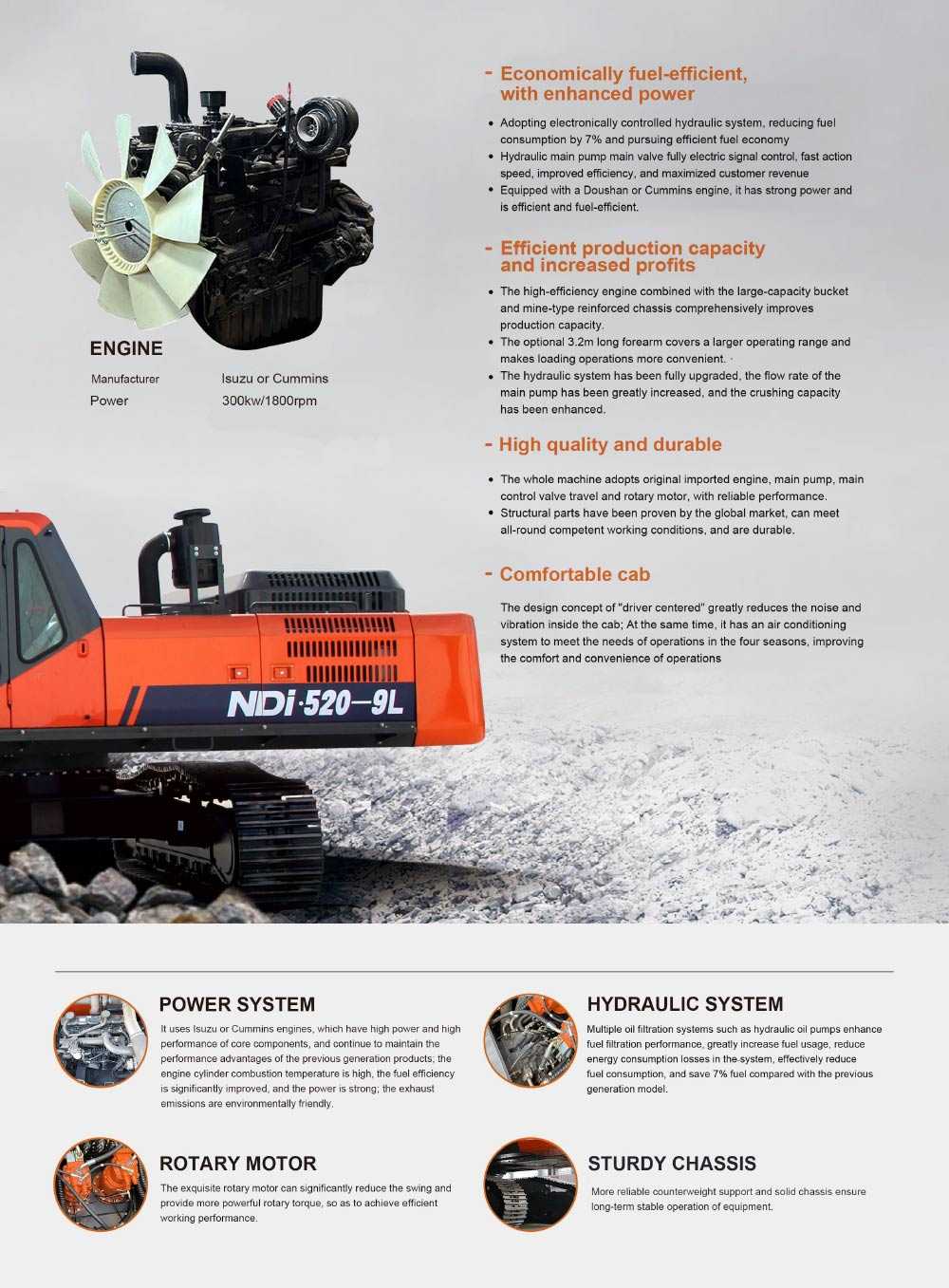 NDI520 — это большой 50-тонный экскаватор производства китайской экскаваторной компании rippa. Большой экскаватор NDI520 подходит для ремонта дорог, планировки земель, засыпки грунта, прокладки трубопроводов, добычи полезных ископаемых, строительства водохранилищ, проектов по дноуглублению рек и канав, строительных проектов и т. д. в рабочих условиях. В то же время 50-тонный большой экскаватор китайского производства также выполняет множество функций, таких как земляные работы, дробление, расчистка траншей, бурение и земляные работы.